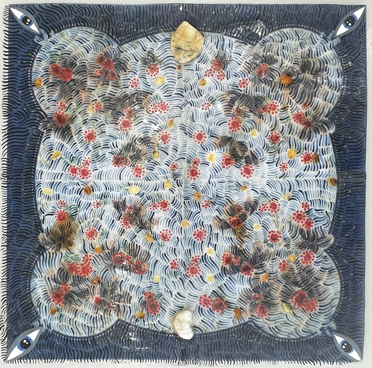 Acrylic, shell, amber, glass, epoxy, napkins, cotton
