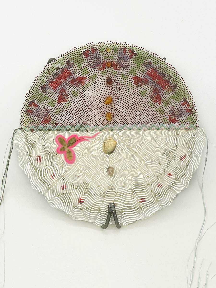 epoxy, plastic, shells, strings and amber on napkin